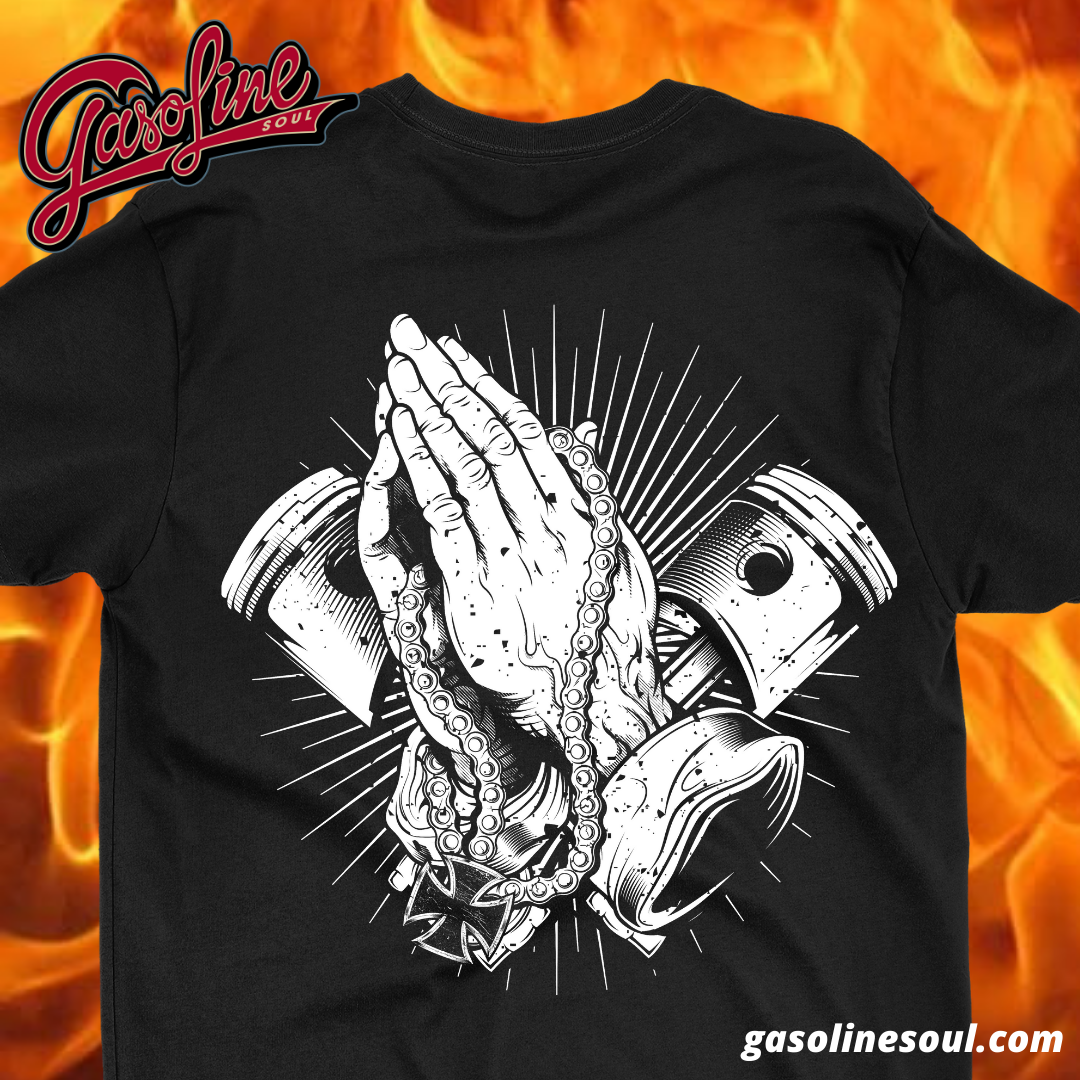 Large BLESS THIS BIKE graphic on the back and our Gasoline Soul Script logo on the front.