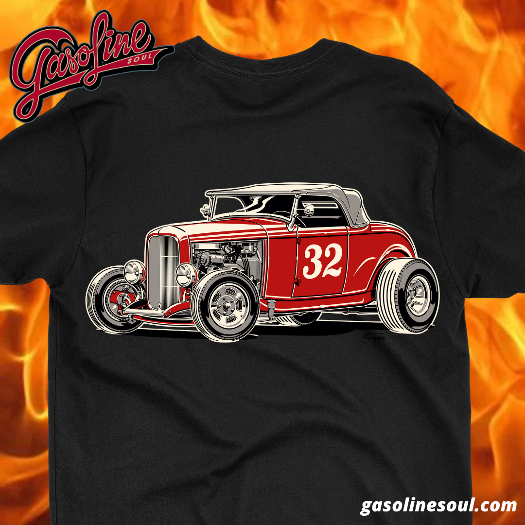 Large DROPTOP DEUCE graphic on the back and our Gasoline Soul Script logo on the front.