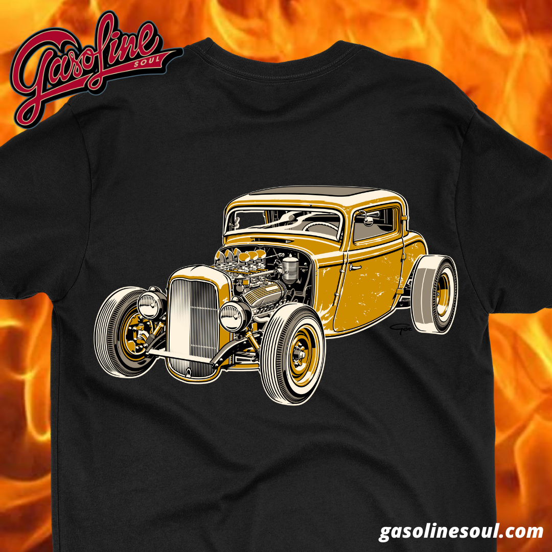 Large PATINA COUPE graphic on the back and our Gasoline Soul Script logo on the front.