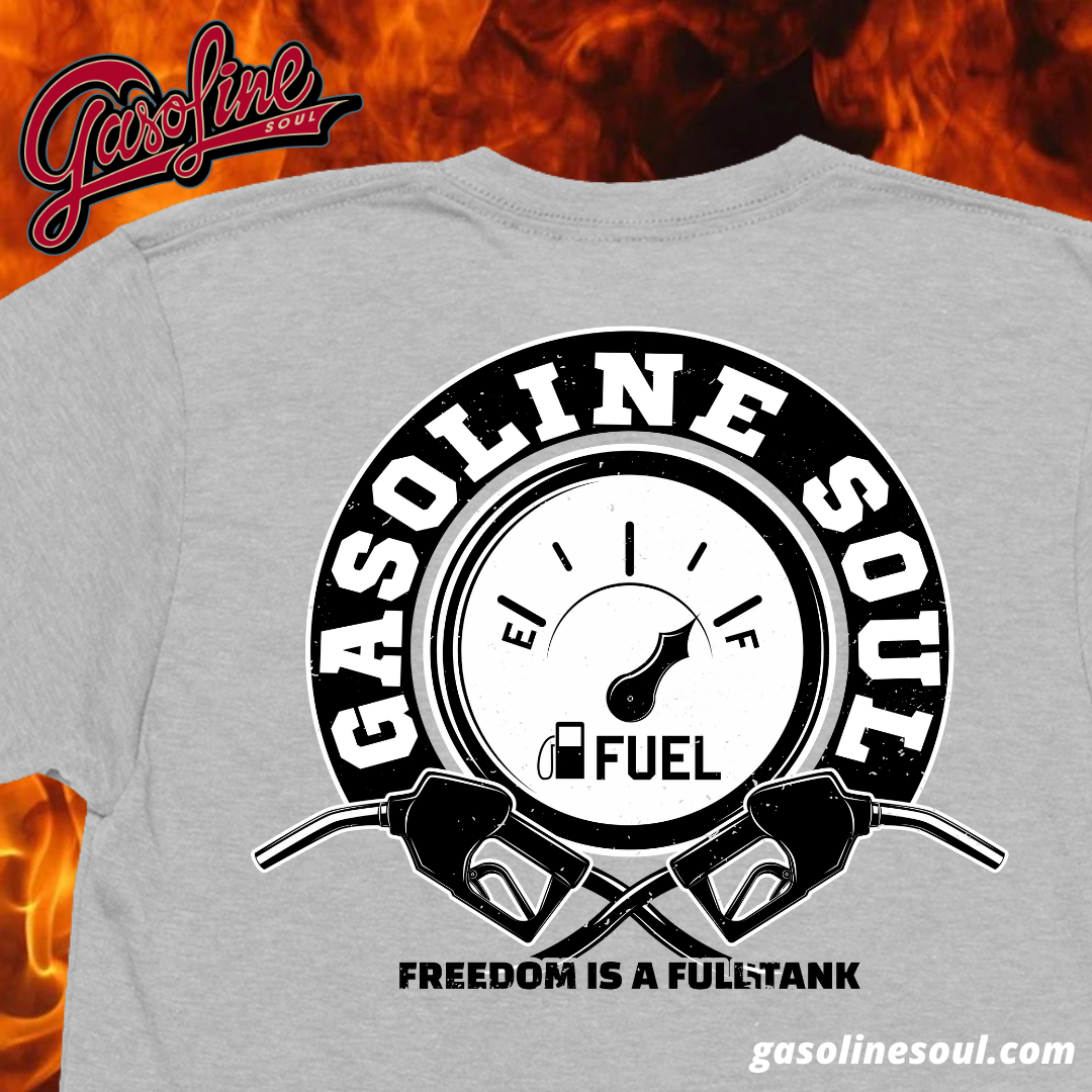FULL TANK FREEDOM IS A FULL TANK design on the back and our GASOLINE SOUL script logo on the left chest!
