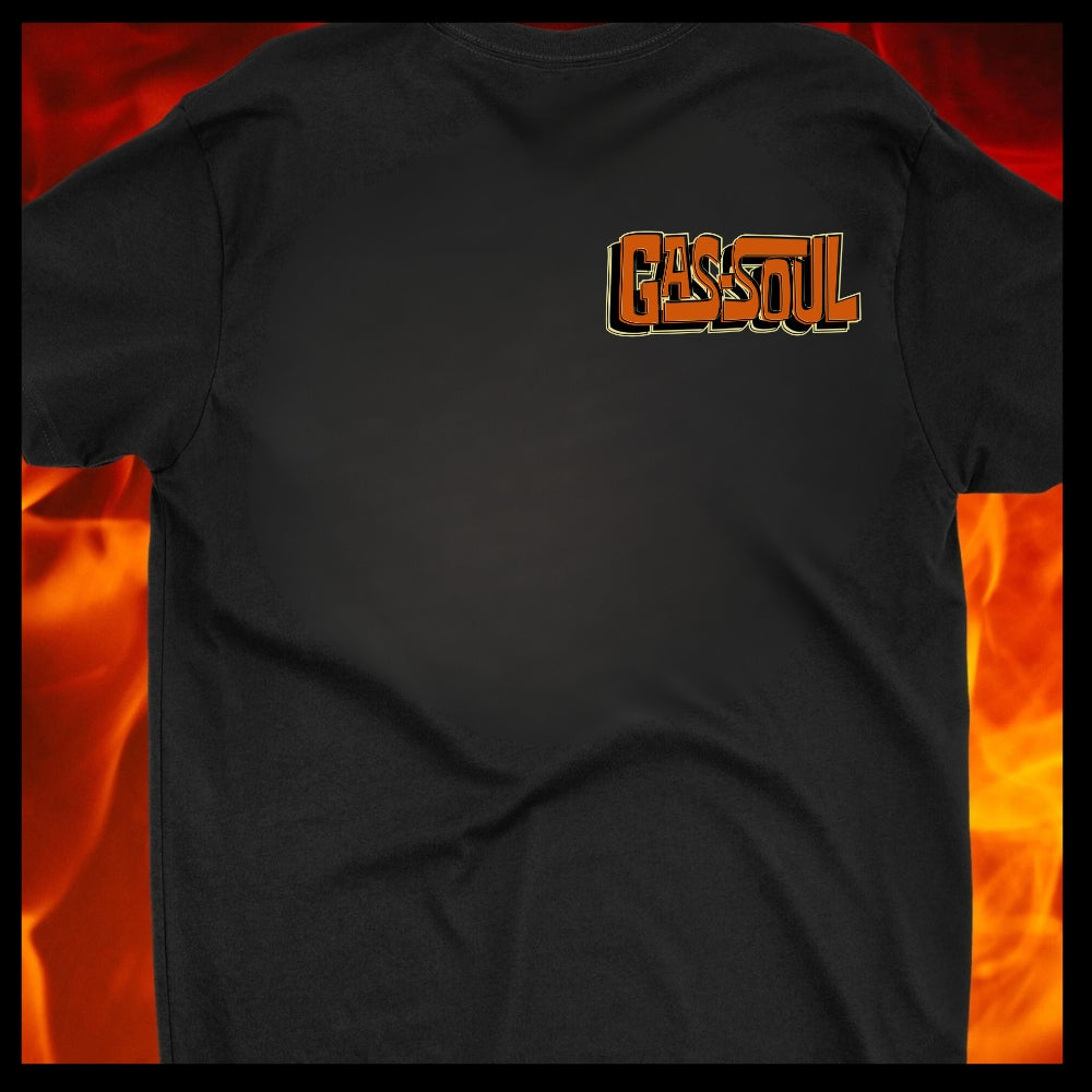 Large Gas-Soul Speed Shop dragster design on the back and a matching left chest logo on the front.