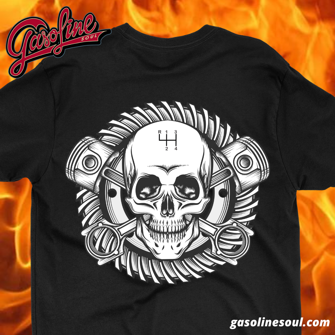 Large GEARHEAD graphic on the back and our Gasoline Soul Script logo on the front.
