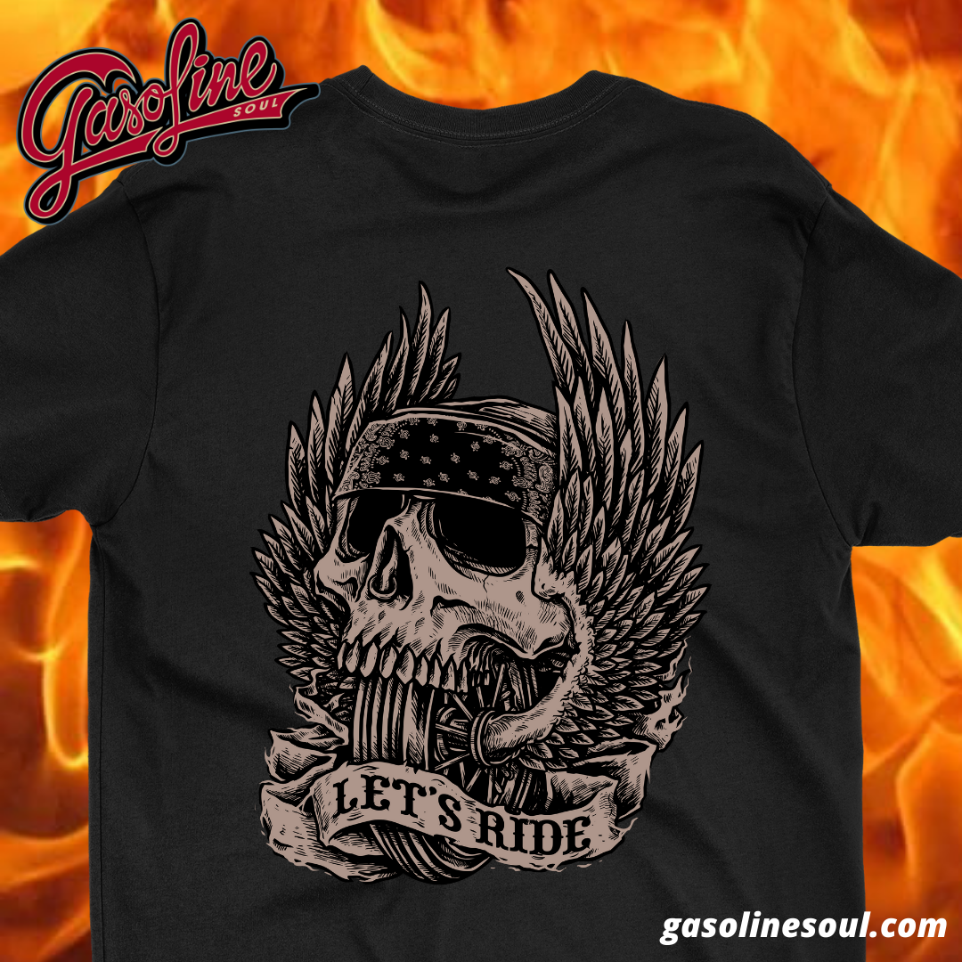 Large LET'S RIDE graphic on the back and our Gasoline Soul Script logo on the front.