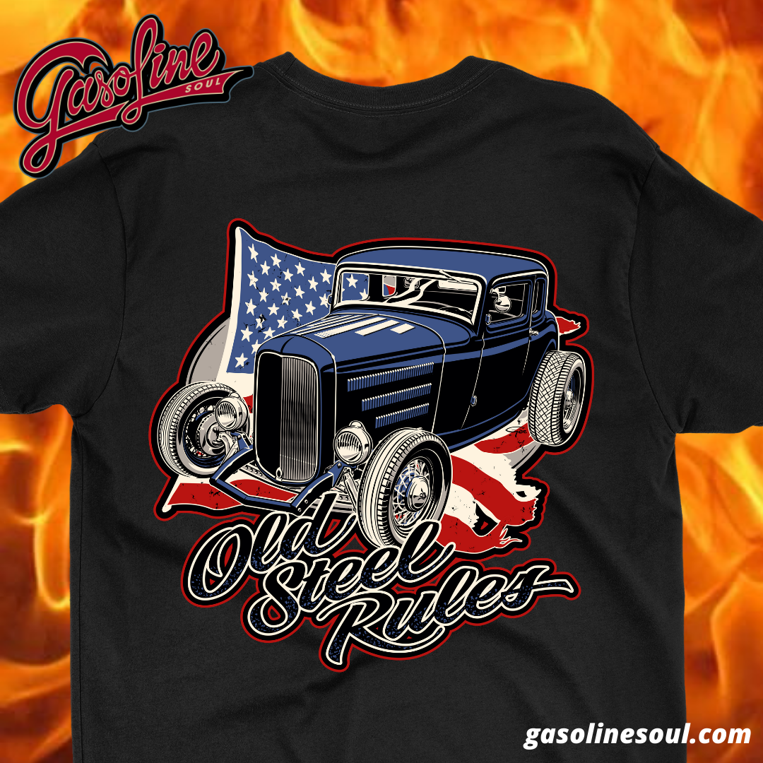 Large OLD STEEL RULES IN THE USA graphic on the back and our Gasoline Soul Script logo on the front.
