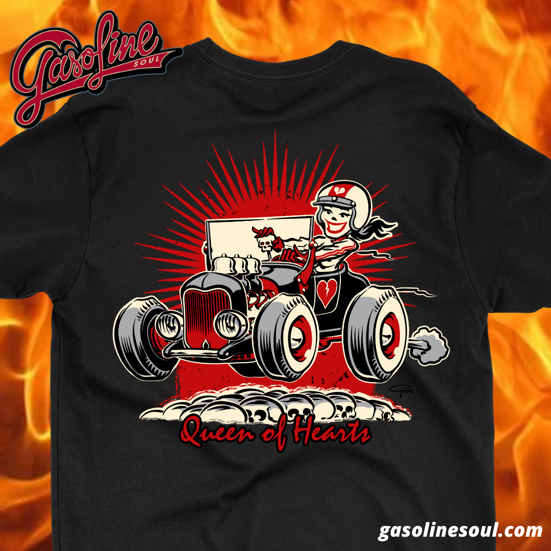 Large QUEEN OF HEARTS graphic on the back and our Gasoline Soul Script logo on the front.
