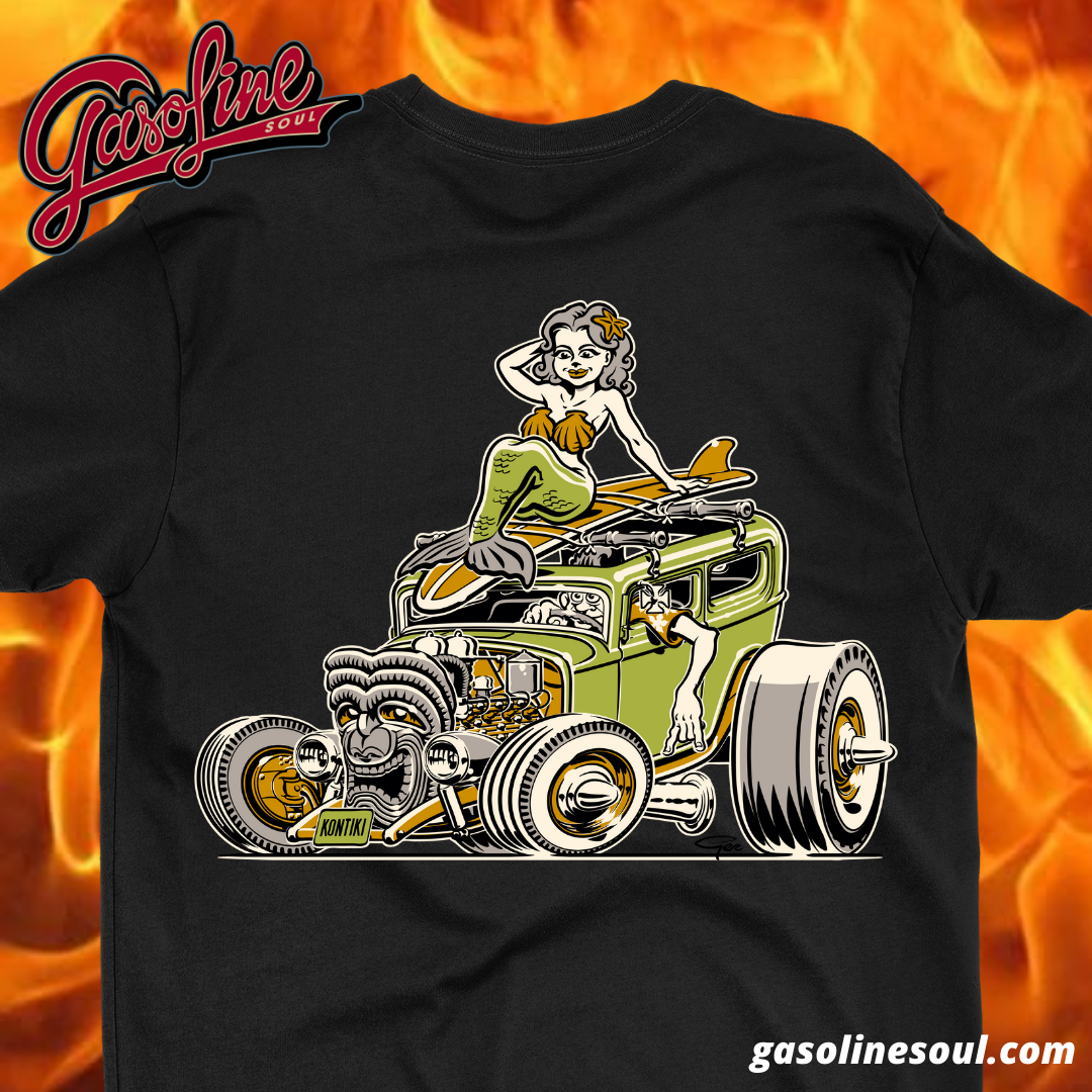 Large ROD-TIKI graphic on the back and our Gasoline Soul Script logo on the front.